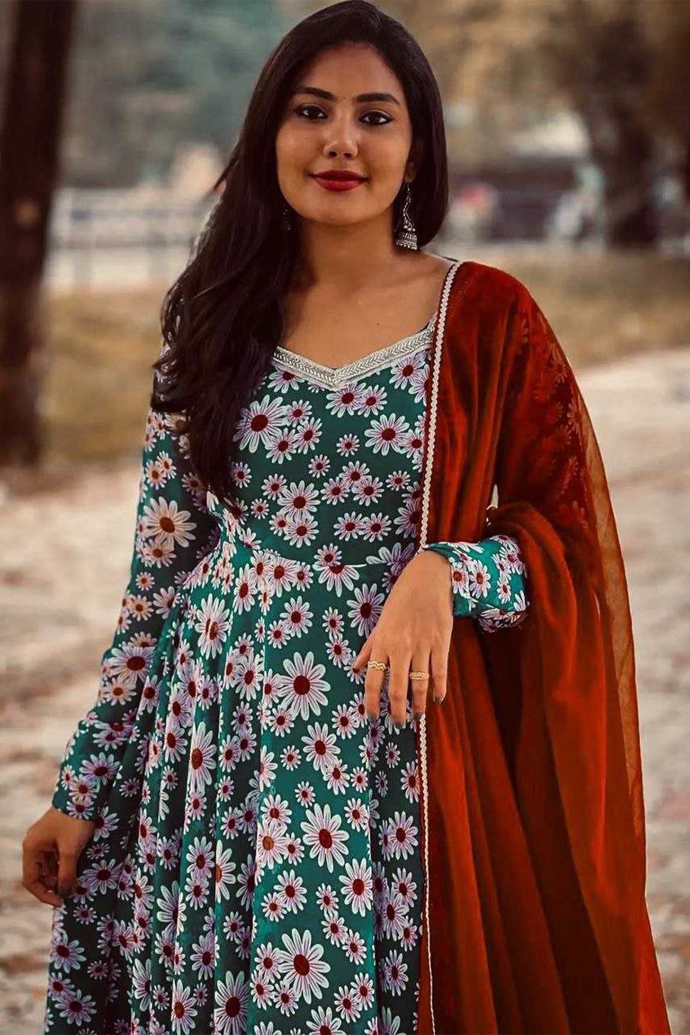 Printed Georgette Anarkalis Dress With Beautiful N Fresh Floral Prints With A Silver Lace Neck Line And A Perfect Contrast Dupatta